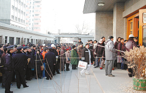據(jù)居民高女士介紹,她接到短信后就趕緊跑過來排隊。8時10分左右,大門前已經(jīng)聚集了近千名居民。隨后大門一開,數(shù)千居民一起往院子里沖。有不少人倒地,地上還有多只皮鞋和帽子被踢來踢去。