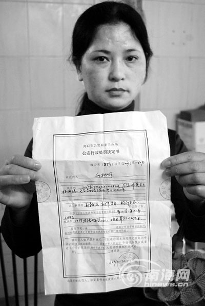 劉女士的“行政處罰決定書”這樣寫著,2007年12月21日22時許,在海口美蘭區板橋路無名麻將館內參與賭博,根據治安管理處罰法規定,對你收繳賭資二十元,治安罰款伍百元。