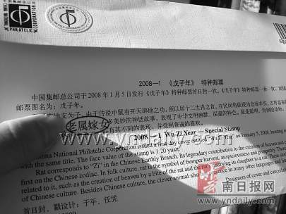 記者隨后來到楚雄集郵經營部,花了2.2元也購買了一枚《戊子年》特種郵票首日封。該套首日封編號為2008-1,印量30萬枚,封上還加貼了中國集郵總公司的防偽標簽。當記者向工作人員詢問首日封文字中出現的錯誤時,這位工作人員顯然完全不知情,經提醒看到后,她連連表示,這樣的情況以前從未發生過,這還是頭一次碰到。她隨即拿出和首日封一起配套發行的一套鼠年郵票仔細查看,記者注意到,上面有首日封設計者于平和任憑的介紹,并且在多處出現了“老鼠嫁女”的字樣,但并無任何差錯。據工作人員介紹,首日封在楚雄的發行量僅70枚,目前已銷售了近40枚。(王維娜 攝影報道)
