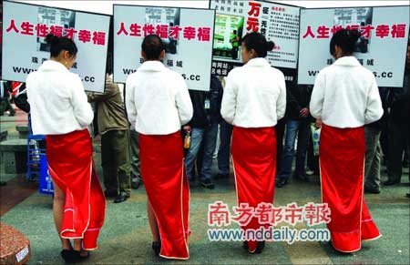 昨天中午,四名靚女穿著白色上衣和紅色裙子,統一的打扮,成了華強北的一道靚麗風景線。靚女們舉著牌子站在華強北的賽博電子廣場前面,中間站著一名男子,面對過往的人群。