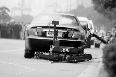 下午4時多,大批民警將車子前后50米范圍內進行戒嚴。排爆人員穿上防爆服,檢查和調試排爆裝備后,匍匐著靠近別克轎車,觀察底盤,然后撤退。