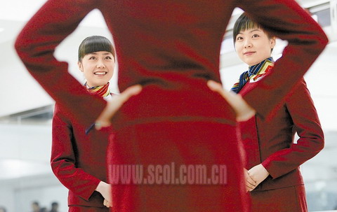 挺胸、抬頭、收腹、頭頂書,保持身體平衡,不讓書掉下來,一站就是幾個(gè)小時(shí)。這就是空姐在飛乘中保持良好體態(tài)的秘訣。“好苦哦,一站就是半天,兩腿僵硬得路都不會(huì)走了。前幾天的訓(xùn)練中還有三名同學(xué)暈倒了!睂W(xué)員蔣瀟瀟說。那天下午的形體課,向往常一樣同學(xué)們?cè)诮淌依,頭頂著書練習(xí)站姿,突然聽到“砰”的一聲,一個(gè)同學(xué)就倒在了地上,接著另一個(gè)同學(xué)也倒下了,大家還沒反應(yīng)過來,又一個(gè)同學(xué)倒在了地上!坝(xùn)練強(qiáng)度太大了,簡(jiǎn)直跟特種兵的訓(xùn)練差不多!闭n間不放松,課外也練。每天早上7點(diǎn)鐘輪流派四名學(xué)員站在大門口,迎接前來上課的每位同學(xué),“早上好、早上好……”這樣的練習(xí)每天都在進(jìn)行。