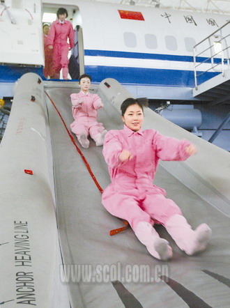 緊急撤離訓(xùn)練廳。廣播中傳出急促的警報(bào)聲,教員發(fā)出“緊急撤離”指令,此刻模擬艙內(nèi)濃煙彌漫,學(xué)員們立即行動(dòng)起來,打開充氣滑梯,然后抬起雙手,將身體彎成90度直角跳出機(jī)艙,從滑梯上滑下。充氣滑梯大約有四層樓高,跳下去對(duì)一些膽小的人來說是需要勇氣的。楊麗忘不了自己剛開始的狀況。20歲的楊麗身材高挑,面容清秀,從小嬌生慣養(yǎng),是爹媽的掌上明珠。那天楊麗聽到老師發(fā)出“一、二、跳”的指令,雙腿軟了,眼淚奪眶而出,持續(xù)了三分鐘。老師大聲吼道:“楊麗,快跳!”面對(duì)四層樓高的滑梯和嚴(yán)厲的訓(xùn)斥,楊麗越發(fā)害怕起來。哭著懇求老師:“能不能不跳,我害怕……”沒等楊麗說完,老師便將她甩下機(jī)艙,這時(shí)楊麗雙手緊緊抓住艙門旁邊的鋼管,雙腳懸在滑梯上拼命地掙扎,大喊:“救命啊,救命!”現(xiàn)在她完全適應(yīng)了。