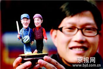 喜劇明星趙本山和宋丹丹今年春晚合演的《火炬手》那對可愛的東北老頭老太形象給觀眾再次留下了深刻的印象。這不,昨天,南京一位巧手的市民陸文著在民俗手工藝表演展示會上,用面捏出了“白云和黑土”,將戴著標志性藍色八角帽的趙本山以及豁牙卻自信的宋丹丹塑造得惟妙惟肖,再添上一旁的奧運火炬“筋斗云”做道具——讓人忍俊不禁。