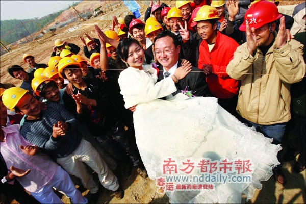 因為大運會建設(shè)工程工期緊,這個春節(jié),來自深圳建筑工務(wù)署大運工程管理處的工程師高輝,昨日把原計劃在老家江西舉辦的終身大事,搬到了大運會的施工現(xiàn)場。而深圳市兩位副市長呂銳鋒、梁道行在工地上為一對新人做了證婚人。