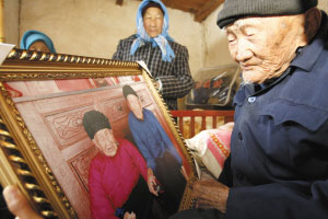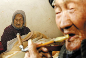 如今,照顧兩人的重?fù)?dān)落到60余歲的兒媳身上,他們的兒子10余年前就去世了。天冷,兒媳就給他們弄了一盆火放進(jìn)屋里,老人坐在火盆旁,時(shí)而抽一口旱煙,再喝一口茶水,神情安詳。而他的老伴,一直不離被窩。