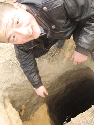 “不知誰在村西山頭上挖了兩個深洞,很奇怪。”昨天上午,記者接到村民提供的報料后立即趕到現(xiàn)場采訪。在村民的指引下,記者看到在兩座長滿雜草的古墓土堆上被人挖出兩個深約5米、直徑在1米左右的洞。村民告訴記者,前幾天,有人發(fā)現(xiàn)一到深夜,就有幾個人影在這里挖什么東西,村民們也沒有在意,可是昨天早上,有村民上山時突然發(fā)現(xiàn)了這兩個很奇怪的洞,一名膽大的村民還系著繩子下去看,洞口雖然剛好容一個人下去,但洞里面卻有很大空間。