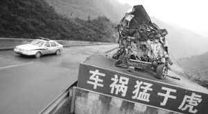 周先生所看到的長安車是一次車禍?zhǔn)鹿实臍埡 S浾咴诂F(xiàn)場看到,殘骸車被擺放在一個(gè)大約2米高的水泥展臺上,3個(gè)輪胎缺失,因?yàn)槭艿街貏?chuàng),已經(jīng)成了一團(tuán)廢鐵,幾根鋼絲將其牢牢捆在展臺上!三關(guān)寺中橋位于319國道彭水境內(nèi),橋下是四五十米的懸崖。從黔江方向過來有一個(gè)90度左右的彎道,彎內(nèi)是石壁,兩邊不能互見,非常危險(xiǎn)。殘骸展臺就在彎外路邊,展臺上寫著“車禍猛于虎”幾個(gè)大字,被司機(jī)稱為“救命展臺”。