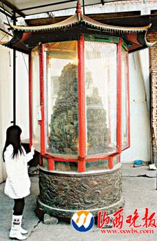 記者在劉學勤家看到,這塊大玉石陳列在院子里一個鋼制八角亭內,亭子四周安裝著鋼化玻璃。大玉石加上底座有3米高,青翠的胎面,雕刻著泰山、華山、恒山、衡山、嵩山五岳山水奇觀。