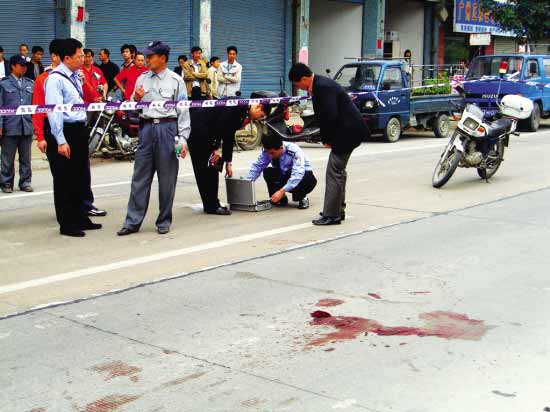 目擊者張先生告訴記者:“上午10點左右,林醫生的兒子騎著自行車來到現場,突然拿出一把30公分長的豬肉刀,沖入配件店內,店主小肖見勢不妙,奪路而逃,林剛悟上去就是一刀。小肖捂著傷口跑到隔壁門店,誰知道剛靠上墻柱,又被他砍了一刀,血濺滿柱。”據其他目擊者回憶,剛悟當時就像死神一樣,無論小肖跑到哪里,他都死死咬住不放。“小肖跑過幾個門面后,沖過馬路逃到對面的牌坊,還是被他追到砍翻在地。這時,有旁觀者才醒過神來,報警救人,可是傷者傷勢很重,送醫院也沒有搶救過來” 。