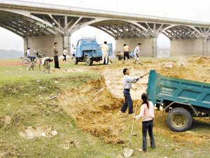 下午3時(shí)左右,兩輛微型卡車就在大橋南岸的橋墩旁進(jìn)行挖砂,不到二十分鐘就裝了滿滿兩車開走了。據(jù)悉,今年以來河砂價(jià)格飛漲,“出廠價(jià)”從原來的每立方米十幾元漲到了現(xiàn)在的68元,只要挖一拖拉機(jī)的砂就能賺兩三百元。