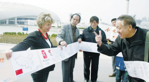 今天,北京奧運圣火將在雅典點燃,隨后開始盛大的奧運火炬傳遞活動。昨天,市民劉長盛帶著自己親手繪制的火炬傳遞城市圖長卷,在市奧體中心前與市民分享快樂,為北京奧運加油。