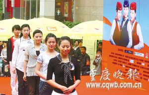 本報(bào)訊 昨日上午,沙坪壩區(qū)三峽廣場(chǎng)數(shù)碼城外,南航“2008中國(guó)新空姐招募大匯”開(kāi)幕。這是繼2006年在全國(guó)以海選模式招聘空姐以來(lái),南航第二次采用同樣方式在重慶招募空姐。據(jù)現(xiàn)場(chǎng)組委會(huì)統(tǒng)計(jì),昨天,通過(guò)網(wǎng)上和現(xiàn)場(chǎng)報(bào)名的女孩有2000來(lái)人,現(xiàn)場(chǎng)有1000多人進(jìn)行了常規(guī)檢驗(yàn),最終留下300人。