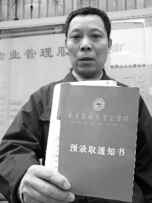 4月8日,50多歲的黃師傅終于收到了南京農(nóng)業(yè)大學工學院成人自考的錄取通知書。然而,通知書上的報名截止日期是1月31日。原來,這封通知書在珠江路北門橋高層小區(qū)物業(yè)門衛(wèi)室里“躺”了3個月。黃師傅說,要想再拿到這樣大紅的錄取通知書,又要“苦”上一年。