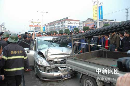 記者在事故現場看到,一輛裝了一大捆鋼筋的小貨車在前,霓桑小轎車緊隨其后。 小貨車上的鋼筋穿過霓桑小轎車的擋風玻璃直插到后車駕駛室,駕駛員身上的六個不同部位被鋼筋刺穿。情況相當危急,駕駛員隨時都有生命危險。