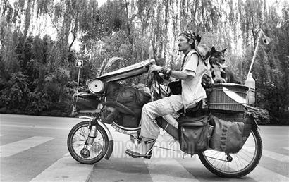 頭上戴著酷酷的骷髏頭巾,蓄著暗紅色的三角尖小胡子,脖子和手腕上掛著古怪的項鏈和手環……昨日中午,一個騎著“哈雷式”自行車,長相酷似海盜的老外在東城拐下街引起了不少好奇者的圍觀。這個名叫Alexandro(如右下圖)的巴西人從2003年就開始騎著自己改裝的自行車出發,橫跨了歐亞大陸的多個國家,接下來的時間里他還將騎著車和他唯一的伙伴——小黑狗“杰”完成環游世界的夢想。