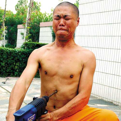 接著,胡瓊又表演沖擊鉆鉆人體。他先用通上電的沖擊鉆鉆木頭和花崗石。木石都被擊穿。然后,胡師傅把腰帶扎得更緊,扎馬下腰、氣沉丹田,大喝一聲,用雙手把高速運轉的沖擊鉆鉆向肚皮。臺下觀眾們屏住呼吸,有人蒙住雙眼不敢看。咝咝作響的沖擊鉆在胡師傅的肚皮上打轉一分鐘后,胡師傅取下沖擊鉆,肚皮竟絲毫無損。隨后,胡師傅還表演了用沖擊鉆鉆太陽穴。表演結束后,胡師傅告訴記者,他表演的電鉆鉆人體,就是民間傳說的“金鐘鐵布衫”功夫。