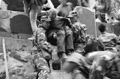雨越下越大,很多戰士的迷彩服上全是泥水,已經完全看不出顏色。幾個戰士抬著一名受傷的女孩,一路上不停地鼓勵著:“千萬不要睡著了!”