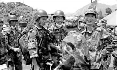 家在四川,同樣受災的戰士伍載鴻說:“我家遭了災,房子倒了沒有關系,可以再建。只要親人還活著就好。讓爸爸媽媽放心,我這也是抗震救災。請黨和政府放心,我不會落下一個受災的鄉親。目前的困難是暫時的,我們一定能渡過難關。再苦再累也要把這個任務完成,只要有一個老百姓有生存的希望,我們都不放棄!”