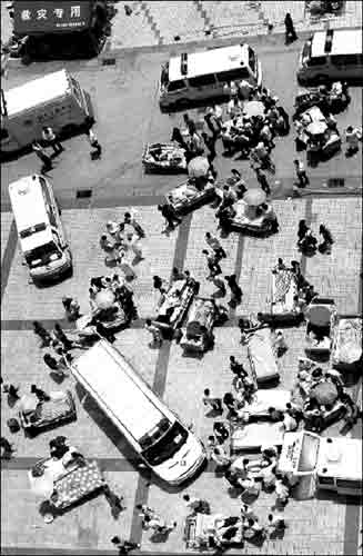 為了使傷員得到更好的治療和照顧,部分傷員將從綿陽轉(zhuǎn)至重慶。從17日晚10時(shí)開始,500多輛急救車開始了轉(zhuǎn)移傷者的行動(dòng)。