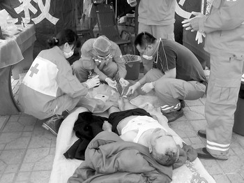 昨日,(四川省)彭州市人民醫院的重傷員手術基本完成,湖南醫療隊分批下到鄉鎮,深入災區最前線進行救治工作。來自長沙市三醫院的任朝暉等醫務人員,驅車數百公里,步行3小時,趕到位于白鹿鎮的3個災民點,為400余名災民進行救治、防病。