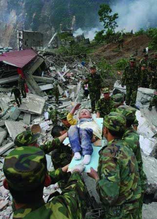 在地震發(fā)生十余小時后,一位滿臉是血的北川男孩從廢墟中被救出。就在武警官兵準(zhǔn)備把他轉(zhuǎn)移到安全地帶時,他艱難地舉起還能動彈的右手,虛弱而又標(biāo)準(zhǔn)地敬了一個少先隊隊禮。擔(dān)架上的小男孩不忘向援救他的官兵叔叔敬禮感恩的舉動,讓無數(shù)的人深受感動。