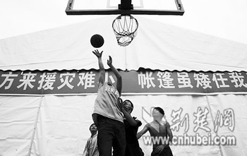 籃球場還有一個籃球架和五分之一個場地空著。傍晚7時,14歲的北川縣漩坪中學初一學生張俊林,和幾個伙伴一起打起籃球。他說,他的家毀了,但沒有人受傷,他現(xiàn)在一家5個人與其他三家人一起住在一個大帳篷里,他現(xiàn)在最盼望的是快點回到真正的教室上課。(特派記者 韋忠南 張泉 陳世昌)