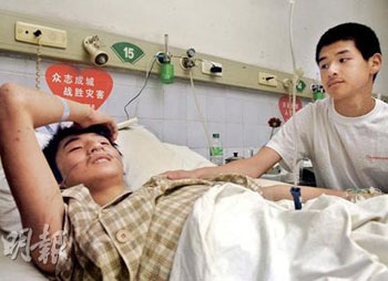 不過,醫(yī)院工作人員表示,廖波的傷口有感染征狀,可能需要再動手術,他也經(jīng)常做噩夢而驚醒,一次次回到地震當天的情景,想起遇難的同學就會流淚。見此情況,李陽想多陪廖波幾天,在醫(yī)院亦有北川中學的老師,答應照顧李陽的衣食住行,并會在他復課前帶他返校。
