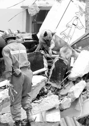 “行動”,賈樹志一聲令下,四只“戰神”立即沖向廢墟堆里,在訓導員的牽引下,不停地來回穿梭,只要有空隙的地方,它都會伸長了脖子往里嗅。半個小時之內,四只搜救犬圍著廢墟整整轉了兩個來回之后,便耷拉著腦袋從廢墟上下來,一副失望的神情。