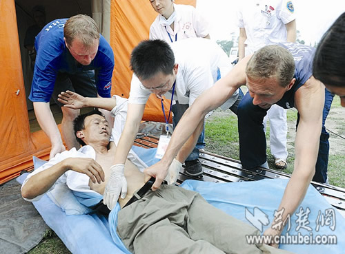 5月24日,汶川大地震后第12天,陽光投射在彭州市職業中學操場上的20座巨型充氣帳篷上,不時有高鼻深目的“老外”進進出出。