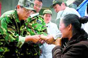 這邊的診斷才剛結束,那邊又傳來新的情況。有位年過八旬的老人跑過來,請醫生到帳篷里為自己的女兒診治。將軍二話不說,立即派出心胸外科主任李魯跟著村民坐上自己的越野車,直奔那位村民所住的帳篷!拔覀冞@個流動醫療隊就是這樣,沿途看到哪里有災民居住的帳篷,就會過去詢問是否需要醫藥,使那些地處偏遠或行動不便的群眾能夠得到醫療救助。”