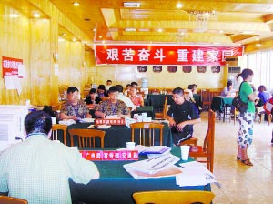 地稅局、國稅局、物價(jià)局、財(cái)金辦……四個(gè)紅色的牌子立在一張鋪有綠布的長桌上,每個(gè)牌子后面都有一名公務(wù)員在值班。長桌共計(jì)有11張,每張桌子上都至少擺放著三個(gè)單位的牌子——宣傳部、廣電局、人武部、組織部……根據(jù)初步統(tǒng)計(jì),在天龍賓館70平方米的餐廳里,有北川45個(gè)單位在緊張有序地辦公。