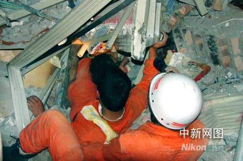 這里還有生命存在!濰坊市公安消防支隊參加救援的官兵迅速聚集在這片廢墟周圍,小心翼翼的搜尋生命奇跡的存在地。這是映秀灣發電廠的賓館,6層樓建筑已經全部垮塌,電廠賓館廢墟堆高約4米,樓板磚墻層層疊壓,上部樓板隨時都有再次坍塌的可能。距現場2米的右側,是一座6層高且遙遙欲墜的未倒塌建筑,余震之中樓體搖搖晃晃,不斷有磚石碎塊掉落,整幢建筑岌岌可危。