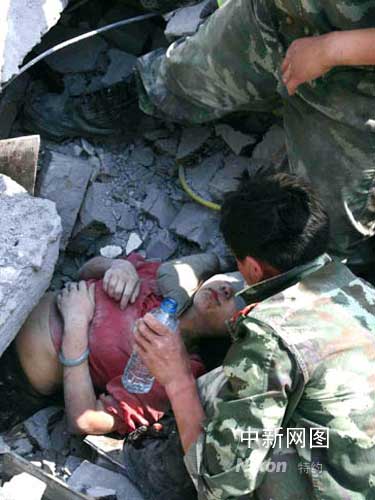 到下午5點鐘左右的時候,搜救官兵已經能夠看到袁藝的頭發了,這讓所有的人不覺精神為之一振。為了使袁藝能夠保持清醒,官兵們不時的陪說話。交談中,孝順的袁藝一直在打聽父母和家人的情況,“他們肯定想不到我還活著”,袁藝話中透露著對劫后余生的無限欣喜與感動。看到了官兵們救援的辛苦,堅強的袁藝反倒不住的安慰不敢加快挖掘速度生怕碰到她傷口的官兵們:“你們加油,我也加油,我不怕疼......”