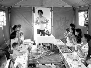 20日,就算是我們的學校開學吧,來了12個娃娃。21日,來了30多個,帳篷很小,坐滿了。看著娃娃們在學習時可以從災難的陰影中暫時走出,我和北京的志愿者都很高興。