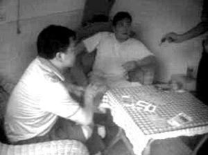 網友“善良老百姓”還在論壇里貼出兩張抓拍的照片:兩名穿藍色T恤的男子,拿著撲克坐在桌前,桌上散亂地鋪著現金;第三人的面目沒出現在畫面里,但可以見到其伸出的一只手。從照片的畫面判斷,拍攝者當時站在房間外。