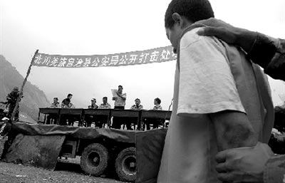 公開處理打擊大會(huì)的會(huì)場選在了擂鼓鎮(zhèn)安置點(diǎn)的一處路邊空地。當(dāng)天下午2點(diǎn)半左右,數(shù)百名安置點(diǎn)居民聞?dòng)嵹s來。不久,18名身穿橙色馬甲的犯罪嫌疑人分別乘兩輛卡車被押至?xí)䦂觥榫S護(hù)現(xiàn)場秩序,當(dāng)?shù)匚渚筷?duì)還派出了60名戰(zhàn)士。由于北川公安局長譚佳敏未到場,一位副局長代其宣讀了公開處理打擊的決定,表示在震后部分不法分子進(jìn)入災(zāi)區(qū),進(jìn)入住宅、商店、企事業(yè)單位盜竊財(cái)物,甚至從遇難者遺體上盜取值錢物件,民憤極大。