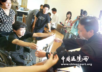 今天上午,吳華林坐著輪椅在其妻子的陪同下來到一中院聽候宣判,法官宣布判決結果,要求全體起立時,坐在輪椅上的吳華林用雙手撐住輪椅的扶手身子挺了起來。聽到宣判結果,吳華林臉上露出了滿意的笑容。他拿出自己寫的“愛”字和“謝謝”的條幅贈送給法官,表達自己的感謝之情。