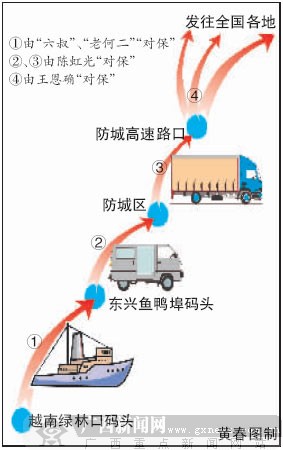 王、陳兩人對(duì)保貨線路也進(jìn)行分割:陳虹光負(fù)責(zé)將橡膠從越南碼頭,用船偷運(yùn)過(guò)東興的魚鴨埠碼頭,再用微型面包車?yán)椒莱菂^(qū),轉(zhuǎn)上王恩確聯(lián)系的大貨車后,再負(fù)責(zé)將大貨車安全送到防城高速路口。從高速公路到國(guó)內(nèi)客戶的路段,則由王恩確負(fù)責(zé)“安全”。