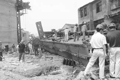 記者看到,這段鐵路橋呈南北走向,向北放眼望去,20多米高的鐵路高架橋像巨龍一樣延伸開去。往南看,僅剩200多米的橋面尚未鋪好。“都快完工了,誰知道還會出這事。”今年四十多歲的老龍租住的房子在鐵路的東側,距離倒塌下來的模架最近只有十幾米,中間隔著一條三米多寬的小路。前天上午9點多,老龍從雙嶼鎮農貿市場賣完菜剛走進二樓的房間,就聽見一陣“嘩啦啦”的巨響,腳下的地板也在顫抖。“地震了!”老龍沒有多想,轉身奔到樓下,才發現原本掛在鐵路橋上近50米長的移動模架不見了,橋墩兩側的房屋被地上騰起的煙塵全部遮住,只有橋墩的頂部還露出了一小段。煙塵持續了20分鐘才逐漸消散。“如果事故提前一個小時,死的人會更多。”據老龍介紹,發生事故的那個路段是交通要道,鐵路東側的居民買菜,都要穿過鐵路橋,到橋西側的雙嶼鎮農貿市場。上午8點左右,正是居民買菜和上班的高峰期。“平常我們也常常從下面穿過,只是擔心上面會掉下些小石頭或者水泥塊,沒有想到這下全掉下來了。”另一位居民告訴記者。