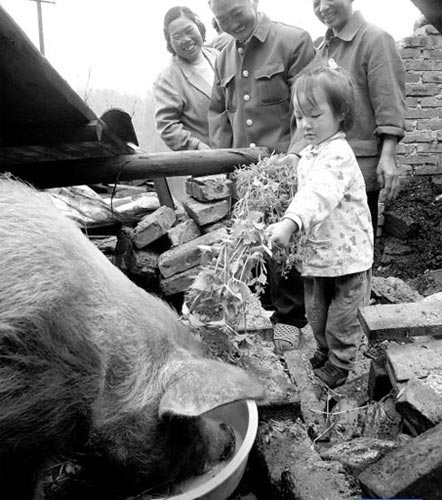 十多個戰士戴上口罩,搬豬圈廢墟上的磚塊、木板。當戰士把底層的一塊木板掀開的時候,男主人喊起來:“我的豬還活著!”原來,豬圈有兩層,上面是木板閣樓,堆放著許多木板和木炭。豬圈垮塌,木板閣樓和地面之間留下半米高的夾縫,這頭豬一直就在夾縫下趴著。黃杰注意到,豬圈垮了后,閣樓上堆放的木炭撒了一地,可能這頭豬吃了一個多月的木炭活了下來。至于豬喝什么,有人猜測是雨水。 (成都商報)