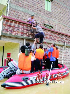 昨日下午4時許,筆者在該縣播植鎮龍福村委看到,屬下的龍村、羅榕、灣頭等10條村莊已是一片澤國,村道一端和樓房上零星散布的村民正在等待救援,幾艘沖鋒舟和橡皮艇來回穿梭,把村民們載到安全地帶(如右圖)。從市里全會請假回來的縣委書記譚培安也親臨“澤國”指揮救援,數十名縣鎮領導干部正在現場忙碌,村中還不時傳出如放鞭炮般的倒房聲。一位剛剛被救出的80歲的阿婆說,活這么大歲數還未見過如此大的暴雨和山洪。據悉,該鎮前日起遭受暴雨襲擊,導致當地悅城河泛濫,河基崩潰嚴重,河水倒灌入村,受浸村莊10多條,受困村民2526人,倒塌房屋117戶352間。前晚起,縣、鎮、村干部齊出動,分頭深入受災村莊連夜動員村民撤離,至昨日下午,已全部安全轉移。(圖/文談細育龍許李均陽)