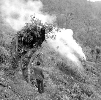 從西雙版納景洪市往景訥鄉走,一路上看到的全是光禿禿的山頭,樹木橫七豎八地倒在一旁,還冒著滾滾濃煙。“近幾年因為橡膠價格飛漲,整個西雙版納開始大規模毀林種膠。樹木砍倒后運不出去,就只有放火燒掉,同時還能做橡膠林肥料,我們這里又回到了‘刀耕火種’的原始社會了。”客車司機說。