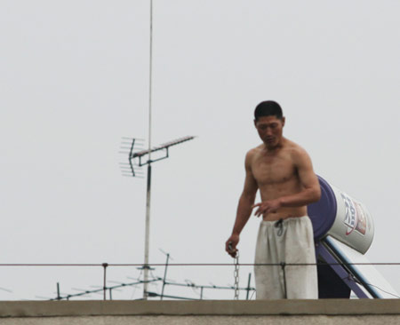 見樓下的圍觀者越來越多,張某開始大聲呼喊,并將衣褲脫掉,然后在樓頂行走,這時天下起小雨,他又將衣褲穿上,過一會兒將衣服再次脫下。