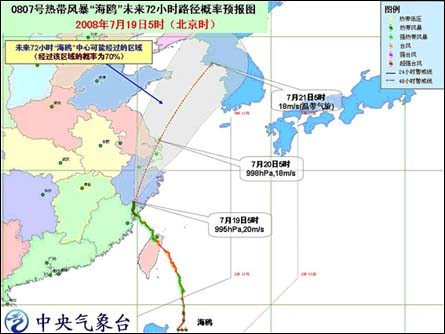 中新網7月19日電 中央氣象臺7月19日06時發布臺風消息:今年第7號強熱帶風暴“海鷗”于昨天晚上在福建省霞浦縣境內減弱為熱帶風暴,今天早晨5時其中心位于浙江省泰順縣境內,就是北緯27.6度、東經119.8度,最大風力有8級(20米/秒)。預計,風暴中心將以每小時15-20公里的速度向北偏東方向移動,強度繼續減弱。