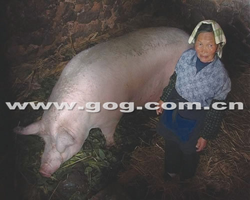 村民們說,這頭豬已被主人喂了整整7年。半年前就有人測量過,它的身長有2.3米,高約1.2米,腰圍也有2米多,體重為1300余斤。這頭豬的主人每天給豬喂的主食是煮熟的玉米面,每天要吃6斤左右的玉米,零食是主人每天給它割的生豬草。