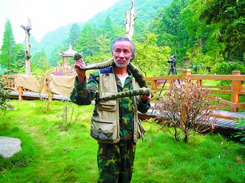 至今,他的左手中指只剩下最下面一節,那是2003年一條莽山烙鐵頭蛇送給他的“禮物”。當年8月,陳遠輝將人工孵化的莽山烙鐵頭蛇拿到“鬼王寨” 放生。一條蛇在身體接觸地面后,突然轉過頭來,狠狠地咬住了陳遠輝的左手中指。為了拍攝到蛇咬人的珍貴鏡頭,陳遠輝竟用右手拿著DV拍了近5分鐘才將蛇甩開。(特派記者 劉軍)