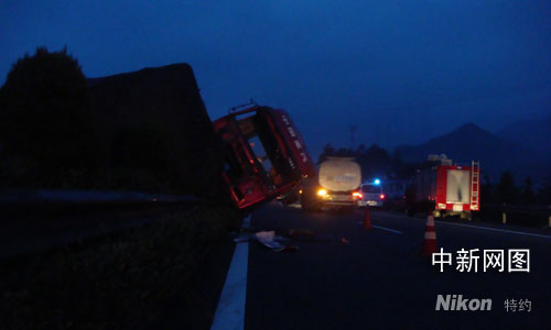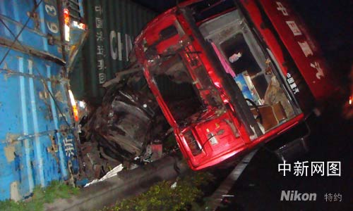據(jù)了解,第一次追尾的兩輛集裝廂卡車已經(jīng)被分離開,工作人員正在拖離事故車輛。在后方不到兩公里處被堵車輛長隊(duì)當(dāng)中,一輛大型集裝廂卡車(為浙BA9429)的車頭已經(jīng)完全搭在了中間的隔離帶上,駕駛室已經(jīng)竄到了旁邊的另一方向車道上。前面是一輛中型廂式貨車(浙JA6312),已經(jīng)被大卡車撞翻,橫在路中央,在兩輛車右側(cè)和前側(cè),先后有四輛車都發(fā)生追尾和刮擦,受傷的(浙JA6312)司機(jī)已經(jīng)被救出送往醫(yī)院。