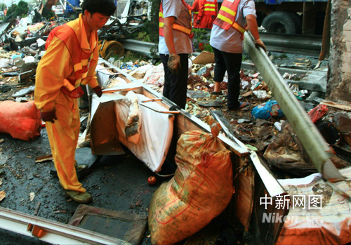記者趕到現場時,受傷人員已被救出送往醫院搶救。高速交警、路政等有關人員正在現場處理,施救人員正在清理路面。一輛臥鋪大客車停在隧道入口的地方,車頭已面目全非,靠駕駛員一側車身大半像被刀劈開一樣。入隧道口之前的中間護欄也已被毀,地上滿是客車上掉下外殼、玻璃等殘骸和旅客行李。