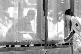 幾分鐘后,那名女子又走了回來,放在玻璃窗內一些食物。記者立即過去與之攀談。
